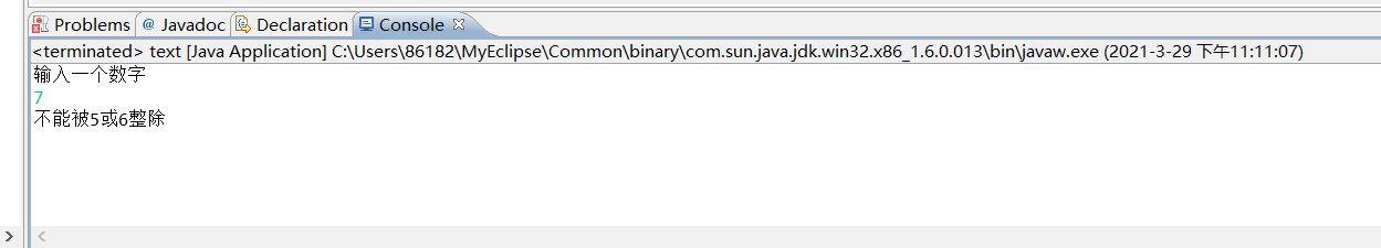 import java.util.Scanner; public class text { /** * @param args */ public static void main(String[] args) { // TODO Auto-generated method stub Scanner input=new Scanner(System.in); System.out.println("输入一个数字"); int a=input.nextInt(); if(a%5==0&&a%6==0){ System.out.println("能被5和6整除"); }else if(a%5==0&&a%6!=0){ System.out.println("能被5整除"); }else if(a%6==0&&a%5!=0){ System.out.println("能被6整除"); }else if(a%5!=0&&a%6!=0){ System.out.println("不能被5或6整除"); } } }