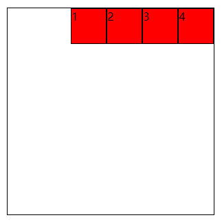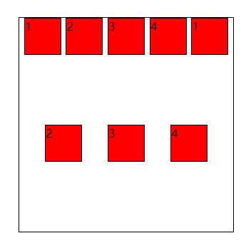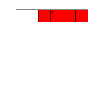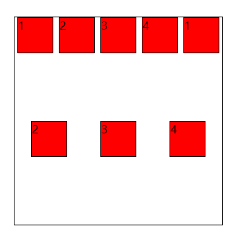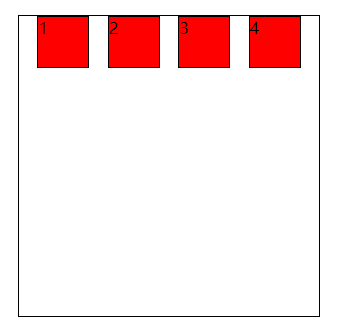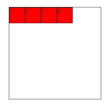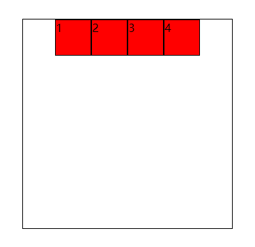 1 <!DOCTYPE html> 2 <html lang="en"> 3 <head> 4 <meta charset="UTF-8"> 5 <meta name="viewport" content="width=device-width, initial-scale=1.0"> 6 <title>Document</title> 7 <style> 8 .box{width: 300px;height: 300px;margin: 100px auto;border: 1px solid black; display: flex;} 9 .box div{width: 50px;height: 50px; background: red;border: 1px solid black;} 10 </style> 11 </head> 12 <body> 13 <div class="box"> 14 <div>1</div> 15 <div>2</div> 16 <div>3</div> 17 <div>4</div> 18 </div> 19 </body> 20 </html>