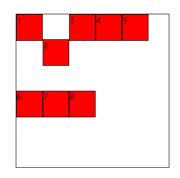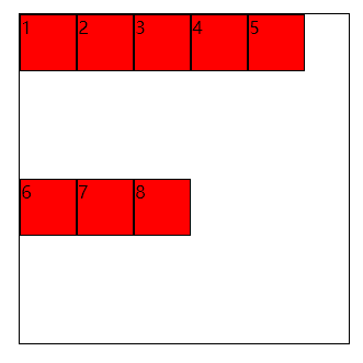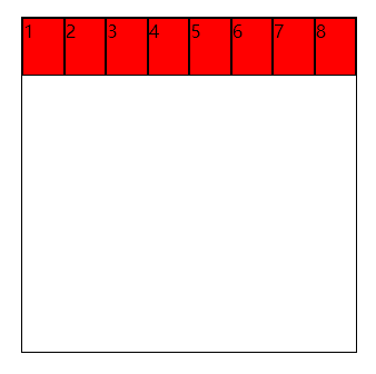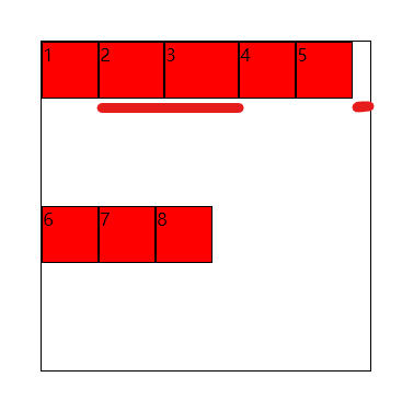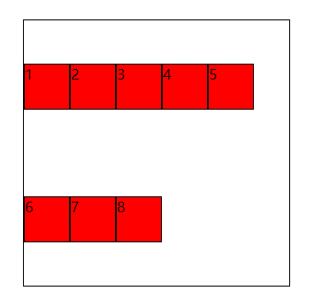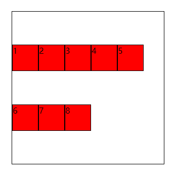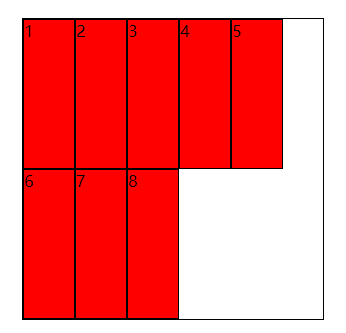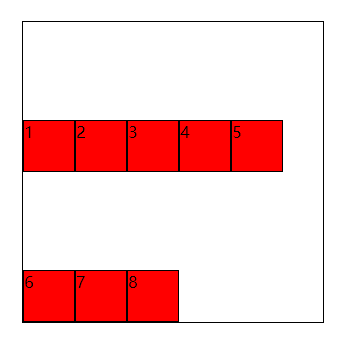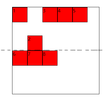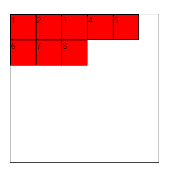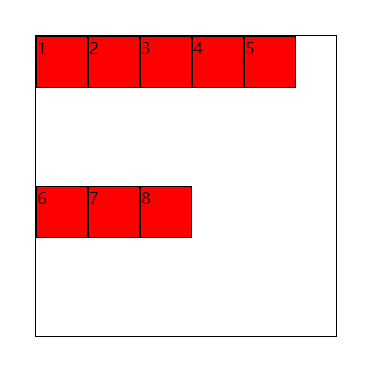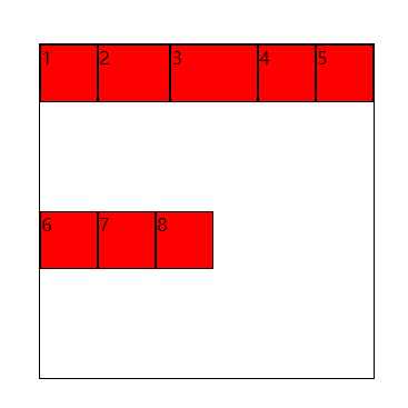 <style> .box{width: 300px;height: 300px;margin: 100px auto;border: 1px solid black; display: flex;flex-wrap: wrap;} .box div{ width:50px;height:50px;background: red;border: 1px solid black;} </style> </head> <body> <div class="box"> <div>1</div> <div>2</div> <div>3</div> <div>4</div> <div>5</div> <div>6</div> <div>7</div> <div>8</div> </div> </body>