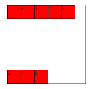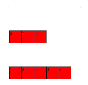 <style> .box{width: 300px;height: 300px;margin: 100px auto;border: 1px solid black; display: flex;flex-wrap: wrap-reverse;} .box div{ width:50px;height:50px;background: red;border: 1px solid black;} </style>