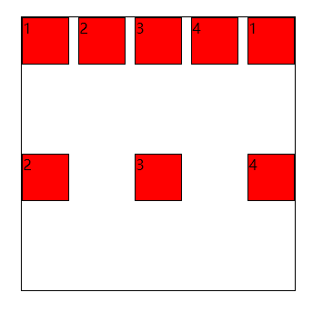 <style> .box{width: 300px;height: 300px;margin: 100px auto;border: 1px solid black; display: flex; flex-wrap: wrap;align-content: space-between;} .box div{ width:50px;height:50px;background: red;border: 1px solid black;} </style>