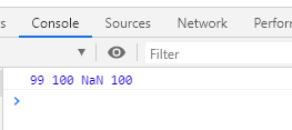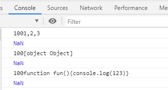 <script> console.log(100 + [1,2,3]); console.log(100 - [1,2,3]); console.log(100 + {name:'张三' , age:'20'}); console.log(100 - {name:'张三' , age:'20'}); console.log(100 + function fun(){console.log(123)}); console.log(100 - function fun(){console.log(123)}); </script>