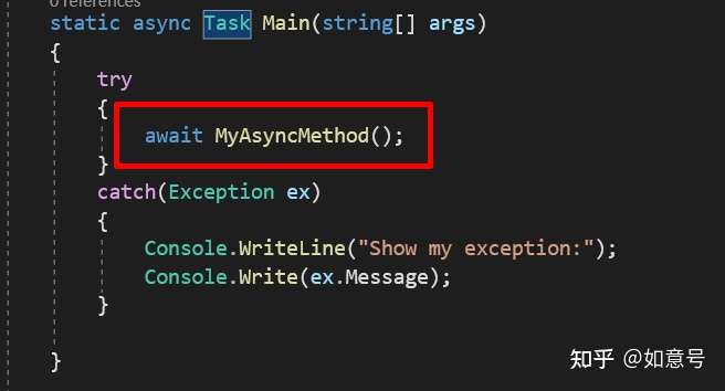 没有抛出异常,因为没有等待 MyAsyncMethod 例程,并且异常会随着任务而丢失。在这种情况下,如果我们使用 Application Insights 或其他日志系统,则永远不会记录异常,我们将无法知道发生了异常。我什至不是在谈论我们应该怎么做才能在应用程序中正确处理这个错误。因此,如果我们想在父方法中捕获错误,第一个错误不是等待任务。如果我们使用“await”关键字,则会抛出异常: