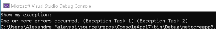 通过这种修改,我们能够捕获所有异常,专门处理AggregateException,它包含一个属性 InnerExceptions,允许我们遍历每个异常。结果是这样的: