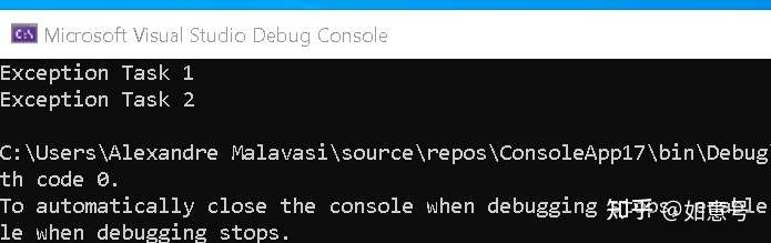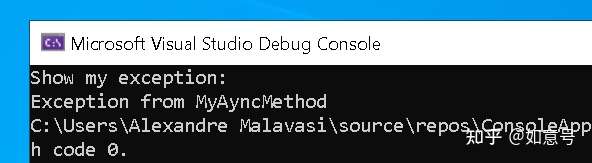 如果我们运行这个控制台应用程序,你认为会发生什么?考虑到MyAsyncMethod故意抛出 ArgumentException,对许多人来说最合乎逻辑的结果是代码的执行将跳转到catch块(第 9 行)。但是,一旦我们运行代码,这就是实际发生的事情: