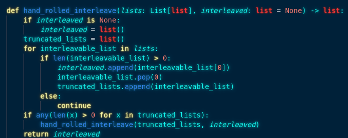有几个问题。首先,它是递归的,尝试阅读时会立即感到困惑。其次,它相当复杂,数据结构和理解不断变化。第三,它在大规模上是缓慢的。我可以使用一种称为 interleave_longest 的方法(以确保我们在用完一个可迭代对象后不会停止),而不是在一个很棒的单行中: