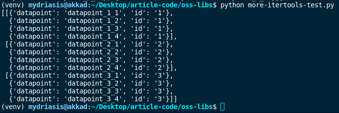 (venv) mydriasis@akkad:~/Desktop/article-code/oss-libs$ python more-itertools-test.py Interleave 10 个长度为 100 的列表每个需要 0.0000069141ms 和 more_itertools Interleave 10 个长度为 100 的列表每个需要 0.0000069141ms ms 与手卷交错