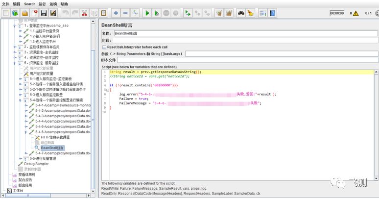 针对请求失败的接口,调整jmeter脚本,给请求失败的接口添加BeanShell断言,如下图所示,然后再进行一次10并发20min的压测,从jmeter.log日志中获取接口请求失败的原因,深入挖掘接口请求失败的原因。