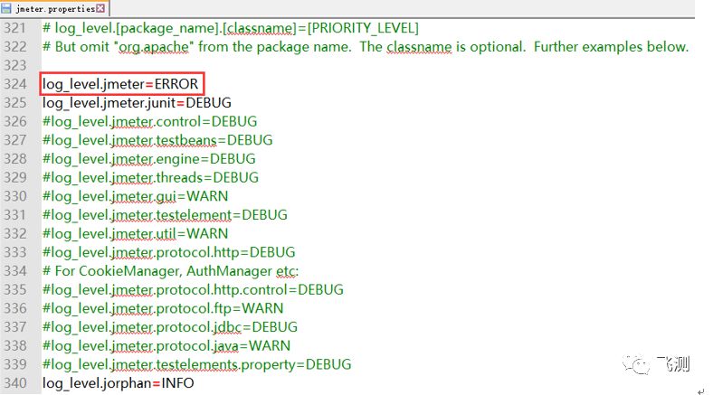 ⑵设置jmeter日志输出和日志级别(此日志需要设置BeanShell断言,在请求失败的接口进行配置,别急,在后面会讲),修改jmeter安装文件中,bin目录下的jmeter.properties文件,调整日志级别为ERROR,如下截图所示: