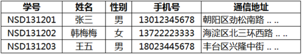 1 mysql> create table db1.学生表(学号 int ,姓名 char(15),性别 char(15),手机号 int,通讯地址 char(50))DEFAULT CHARSET=utf8; 2 Query OK, 0 rows affected (0.01 sec) 3 4 mysql> desc 学生表; 5 +--------------+----------+------+-----+---------+-------+ 6 | Field | Type | Null | Key | Default | Extra | 7 +--------------+----------+------+-----+---------+-------+ 8 | 学号 | int(11) | YES | | NULL | | 9 | 姓名 | char(15) | YES | | NULL | | 10 | 性别 | char(15) | YES | | NULL | | 11 | 手机号 | int(11) | YES | | NULL | | 12 | 通讯地址 | char(50) | YES | | NULL | | 13 +--------------+----------+------+-----+---------+-------+ 14 5 rows in set (0.00 sec) 15 16 mysql> show create table 学生表; 17 +-----------+-------------------------------------------------------------------------------------------------------------------------------------------------------------------------------------------------------------------------------------------------+ 18 | Table | Create Table | 19 +-----------+-------------------------------------------------------------------------------------------------------------------------------------------------------------------------------------------------------------------------------------------------+ 20 | 学生表 | CREATE TABLE `学生表` ( 21 `学号` int(11) DEFAULT NULL, 22 `姓名` char(15) DEFAULT NULL, 23 `性别` char(15) DEFAULT NULL, 24 `手机号` int(11) DEFAULT NULL, 25 `通讯地址` char(50) DEFAULT NULL 26 ) ENGINE=InnoDB DEFAULT CHARSET=utf8 | 27 +-----------+-------------------------------------------------------------------------------------------------------------------------------------------------------------------------------------------------------------------------------------------------+ 28 1 row in set (0.00 sec)