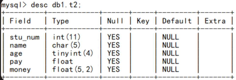 mysql> create table t2( stu_num int(11), name char(5), age tinyint(4), pay float, money float(5,2) ); Query OK, 0 rows affected (0.01 sec) mysql> desc db1.t2; +---------+------------+------+-----+---------+-------+ | Field | Type | Null | Key | Default | Extra | +---------+------------+------+-----+---------+-------+ | stu_num | int(11) | YES | | NULL | | | name | char(5) | YES | | NULL | | | age | tinyint(4) | YES | | NULL | | | pay | float | YES | | NULL | | | money | float(5,2) | YES | | NULL | | +---------+------------+------+-----+---------+-------+ 5 rows in set (0.00 sec)