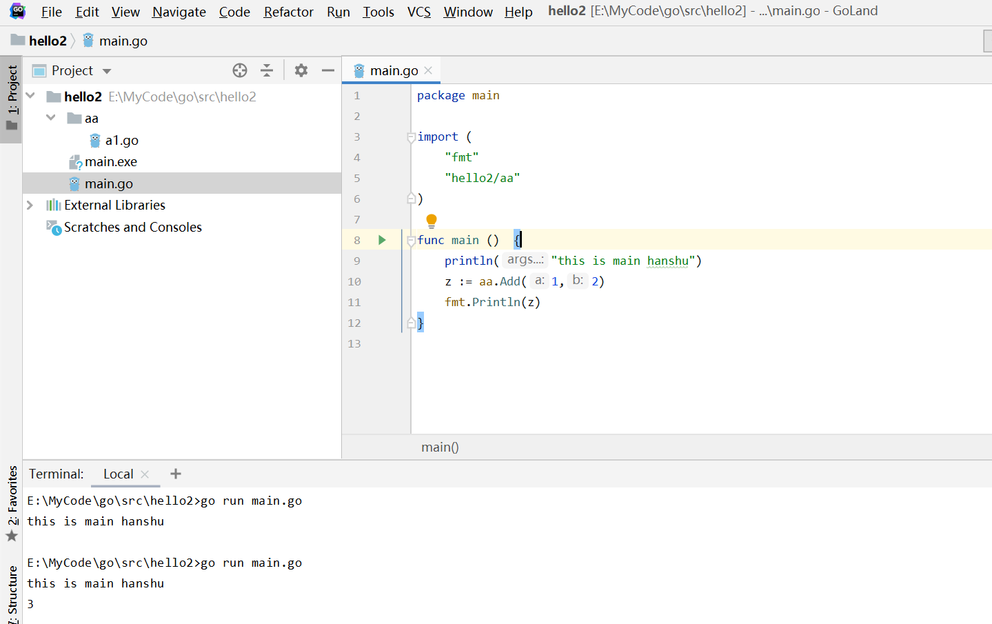 E:\MyCode\go\src\hello2>go run main.go this is main hanshu 3