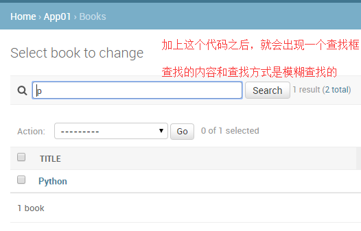 #自定义一个类,继承ModelAdmin class BootConfig(admin.ModelAdmin): #自己定义list_display数据,其他的数据用admin.ModelAdmin中的属性 list_display = ['title','price'] #这里写上这个自定义的类 admin.site.register(Book,BootConfig)
