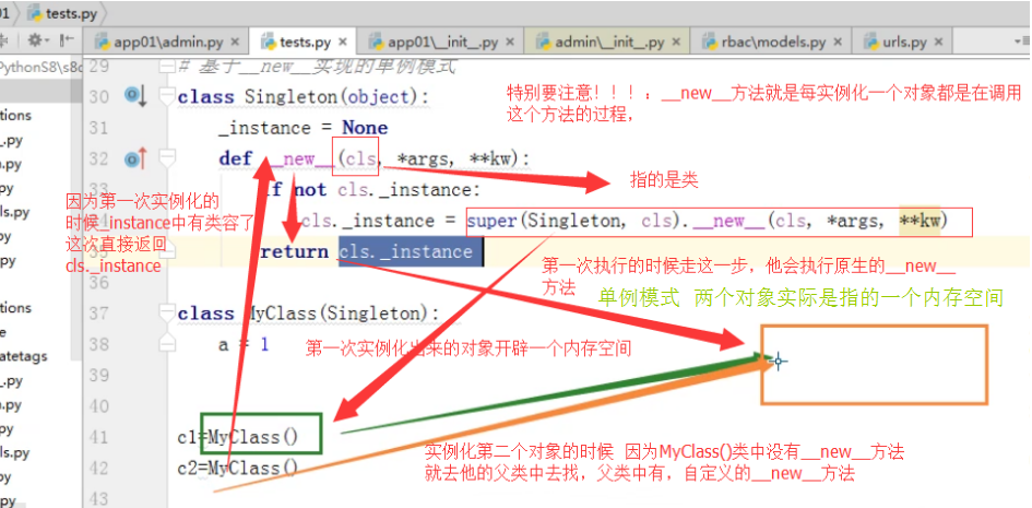 为了使类只能出现一个实例,我们可以使用 __new__ 来控制实例的创建过程,代码如下: