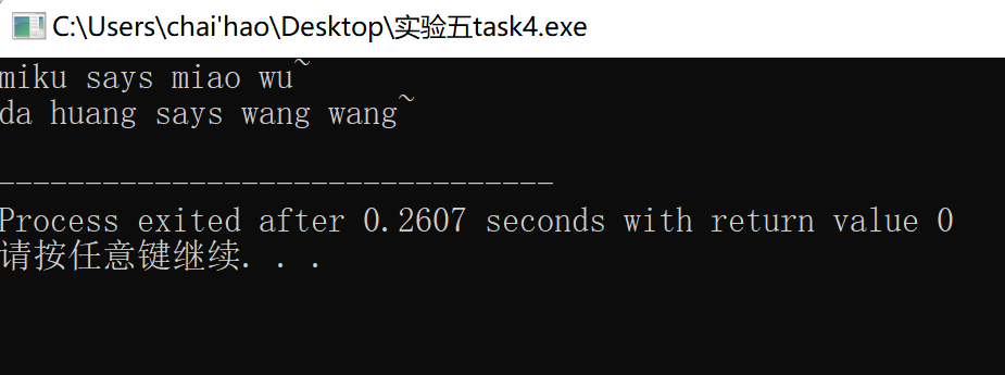 #include<iostream> #include"pets.h" void play(MachinePets &obj){ std::cout<<obj.get_nickname()<<" says "<<obj.talk()<<std::endl; } void test(){ PetCats cat("miku"); PetDogs dog("da huang"); play(cat); play(dog); } int main(){ test(); }