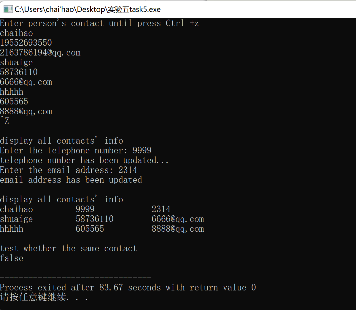 #include<iostream> #include<fstream> #include<vector> #include"Persons.h" using namespace std; void test(){ using namespace std; vector<Person> phone_book; Person p; cout<<"Enter person's contact until press Ctrl +z"<<endl; while(cin>>p) phone_book.push_back(p); cout<<"\ndisplay all contacts' info\n"; phone_book.at(0).update_telephone(); phone_book.at(0).update_email(); cout<<"\ndisplay all contacts' info\n"; for(auto &phone: phone_book) cout<<phone<<endl; cout<<"\ntest whether the same contact\n"; cout<<boolalpha<<(phone_book.at(0)==phone_book.at(1))<<endl; } int main(){ test(); }