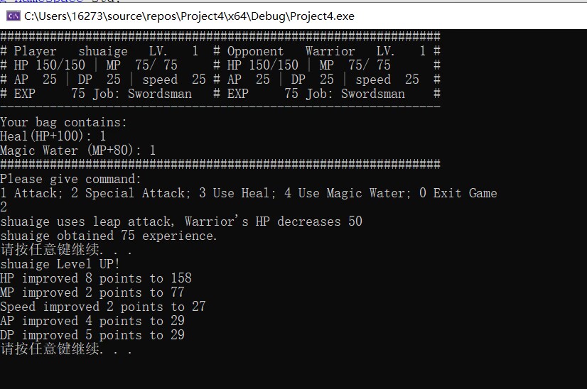 //======================= // main.cpp //======================= // main function for the RPG style game #include <iostream> #include <string> #include "swordsman.h" using namespace std; int main() { string tempName="0"; bool success = 0; //flag for storing whether operation is successful cout << "Please input player's name: "; cin >> tempName; // get player's name from keyboard input player* human;// use pointer of base class, convenience for polymorphism human = new swordsman(1, tempName); int tempJob; // temp choice for job selection do { cout << "Please choose a job: 1 Swordsman, 2 Archer, 3 Mage" << endl; cin >> tempJob; system("cls"); // clear the screen switch (tempJob) { case 1: delete human; human = new swordsman(1, tempName); // create the character with user inputted name and job success = 1; // operation succeed break; default: break; // In this case, success=0, character creation failed } } while (success != 1); // so the loop will ask user to re-create a character int tempCom; // temp command inputted by user int nOpp = 0; // the Nth opponent for (int i = 1; nOpp < 5; i += 2) // i is opponent's level { nOpp++; system("cls"); cout << "STAGE" << nOpp << endl; cout << "Your opponent, a Level " << i << " Swordsman." << endl; system("pause"); swordsman enemy(i, "Warrior"); // Initialise an opponent, level i, name "Junior" human->reFill(); // get HP/MP refill before start fight while (!human->death() && !enemy.death()) // no died { success = 0; while (success != 1) { showinfo(*human, enemy); // show fighter's information cout << "Please give command: " << endl; cout << "1 Attack; 2 Special Attack; 3 Use Heal; 4 Use Magic Water; 0 Exit Game" << endl; cin >> tempCom; switch (tempCom) { case 0: cout << "Are you sure to exit? Y/N" << endl; char temp; cin >> temp; if (temp == 'Y' || temp == 'y') return 0; else break; case 1: success = human->attack(enemy); human->isLevelUp(); enemy.isDead(); break; case 2: success = human->specialatt(enemy); human->isLevelUp(); enemy.isDead(); break; case 3: success = human->useHeal(); break; case 4: success = human->useMW(); break; default: break; } } if (!enemy.death()) // If AI still alive enemy.AI(*human); else // AI died { cout << "YOU WIN" << endl; human->transfer(enemy); // player got all AI's items } if (human->death()) { system("cls"); cout << endl << setw(50) << "GAME OVER" << endl; delete human; // player is dead, program is getting to its end, what should we do here? system("pause"); return 0; } } } delete human; // You win, program is getting to its end, what should we do here? system("cls"); cout << "Congratulations! You defeated all opponents!!" << endl; system("pause"); return 0; }