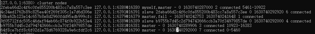 2、cluster nodes //查看集群信息。当主节点宕机,从节点升为主节点,原主节点恢复,成为现主节点的从节点