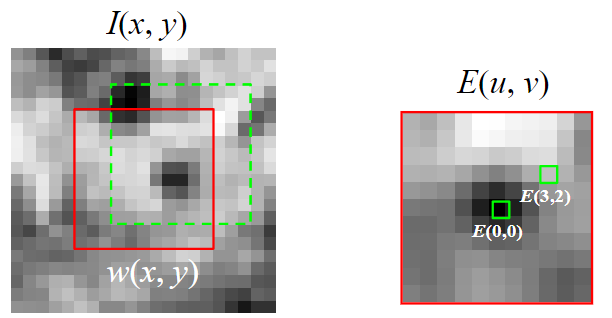 可以看到,当(u, v)等于(0, 0)时,窗口移动量为0,红框和绿框重合,没有差异,E(u,v)也就是0。
