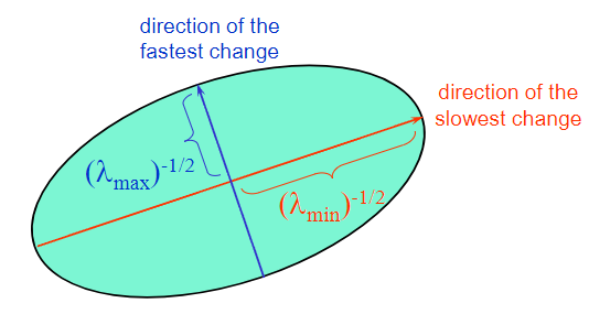 如下图,这里的λ1和λ2反映了椭圆的长轴和短轴,λmax越大,则该轴越短,从二次曲面上看,就是“爬升”的速度越快,且在这个方向上速度是最快的。反之,在λmin这个轴上,变化的最缓慢。