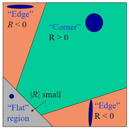 我们利用M矩阵得到λ1和λ2后,如果λ1远远大于λ2时,说明在一个方向上E(u,v)变化率远大于另一个方向,这应该是一条edge;如果λ1和λ2都很小,说明各个方向上变化率都小,这就是一个平坦的区域;如果λ1和λ2都很大,则该点在各个方向上变化率都很大,则该点更可能是一个角点。