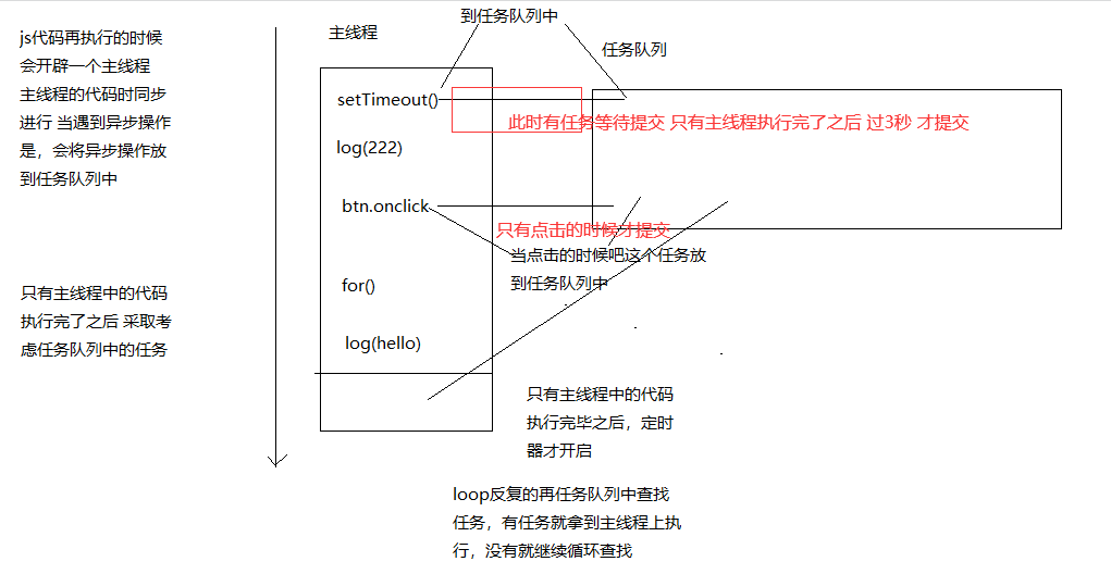 - 主线程执行的过程中,setTimeout onclick等会执行,只是里面的callback会去排队提交。