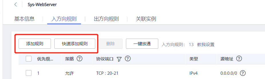 1. 安全组开放3306端口【弹性云服务器ECS】==》【安全组】==》【Sys-WebServer 配置规则】==》【添加规则or快速添加规则】(自行配置)