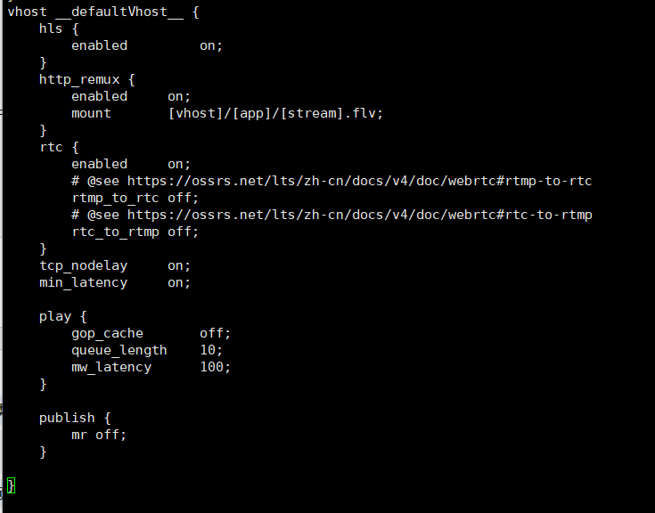 tcp_nodelay on; min_latency on; play { gop_cache off; queue_length 10; mw_latency 100; } publish { mr off; } }