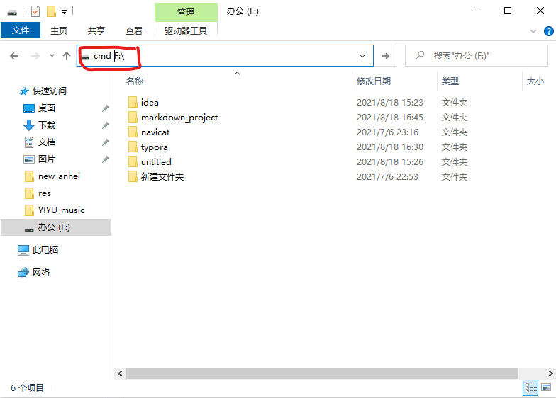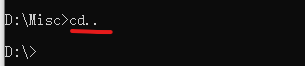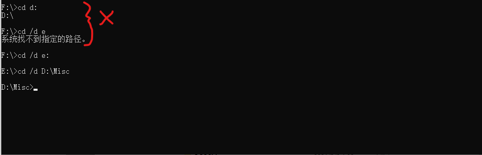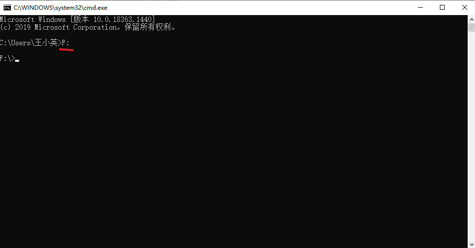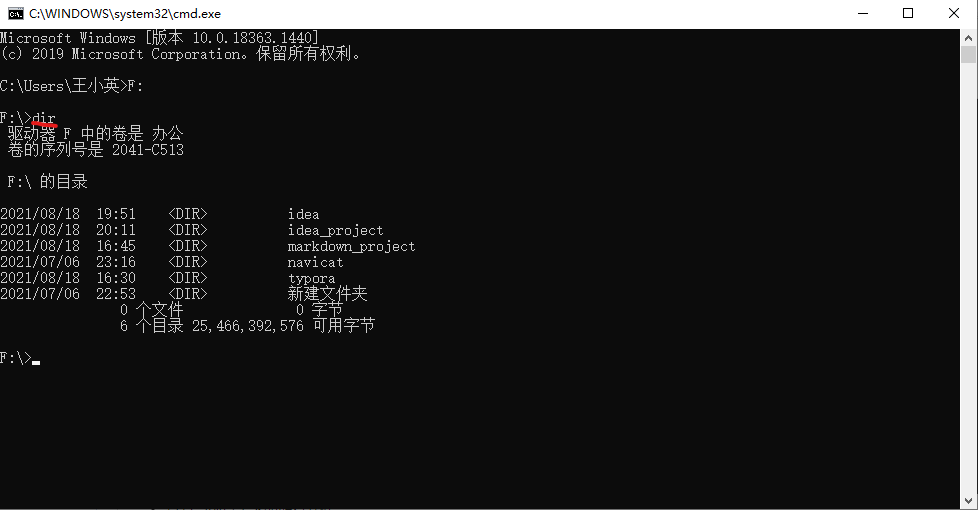 - 盘符切换:字母:,例如从C盘切换到F盘,F: