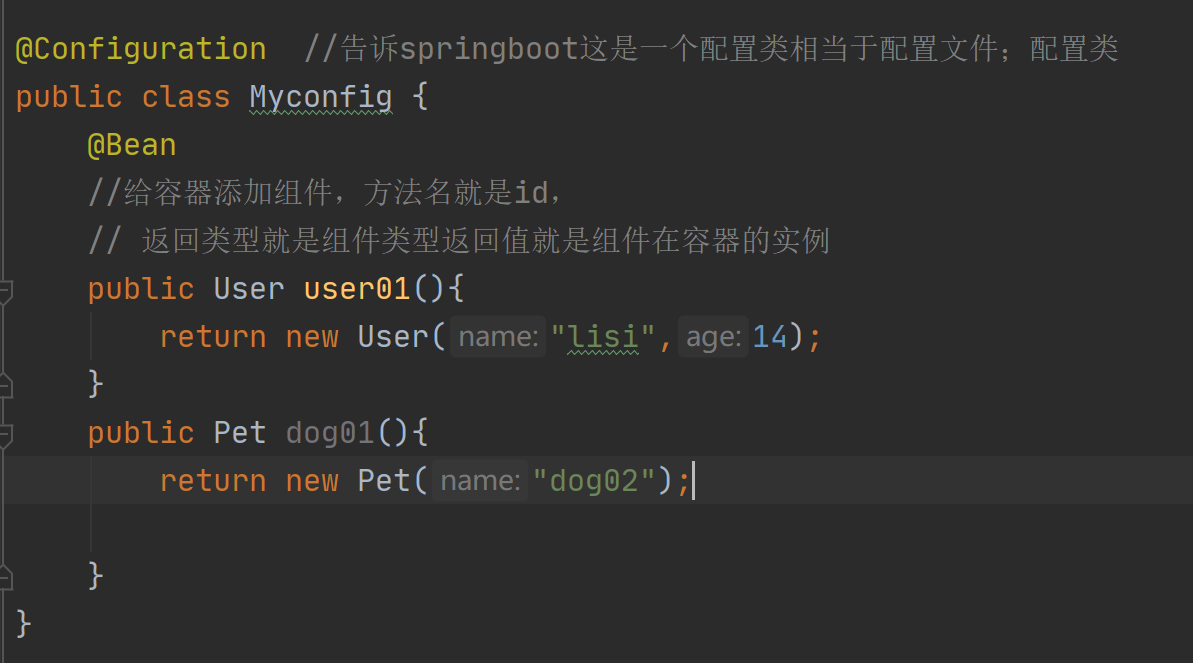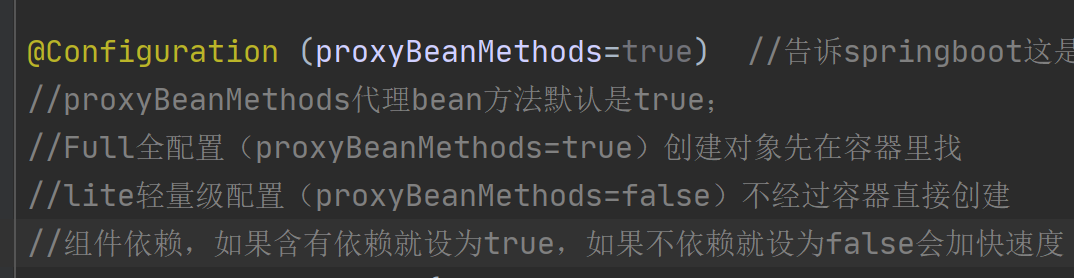 //默认是单例模式,不管创建多少对象都是同一个,配置类本身也是一个组件;proxyBeanMethods:代理bean的方法