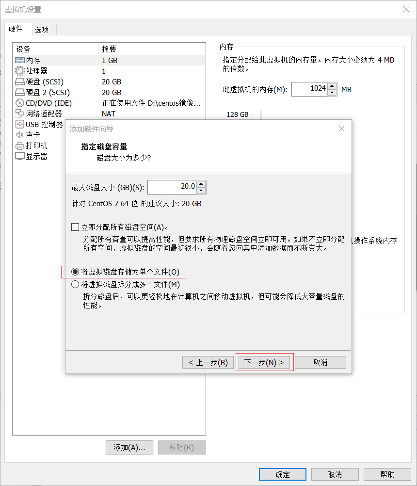 然后点击下一步,这里磁盘大小根据自己需求设置,这里注意将虚拟磁盘存储为单个文件性能会比多个文件好。