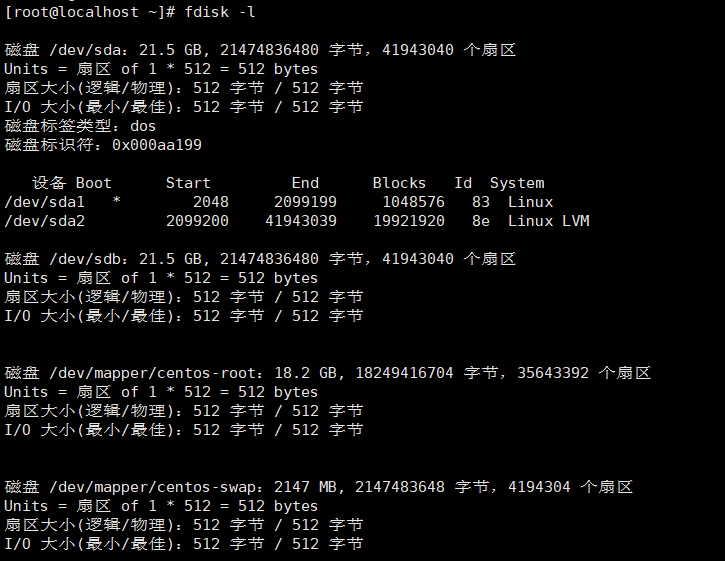 首先通过fdisk -l查看系统上所以硬盘和分区的使用情况