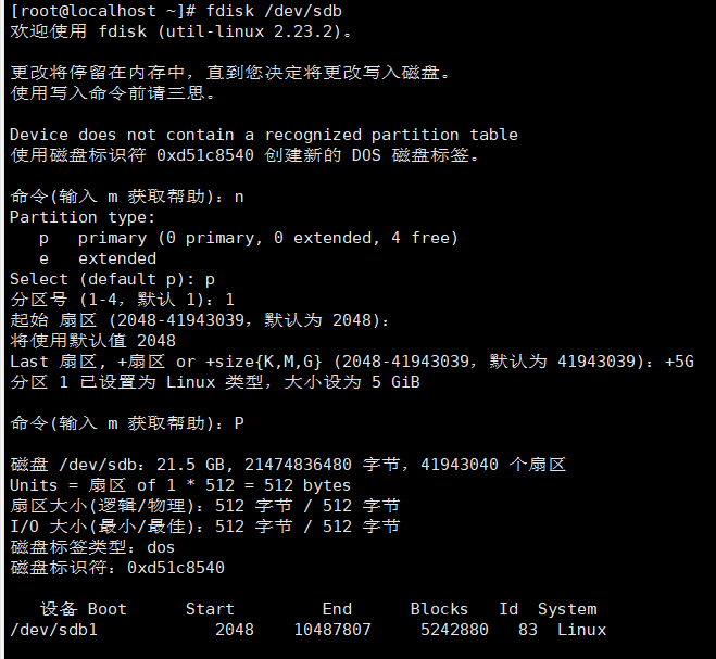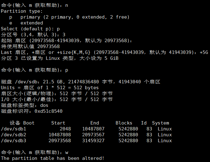 fdisk /dev/sdb——fdsik创建分区表 因为新添加的硬盘名称为 sdb 所以就是/dev/sdb