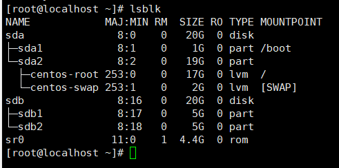 此时可以通过lsblk命令查看分区,此时sdb下已经出现两个为5G的分区。