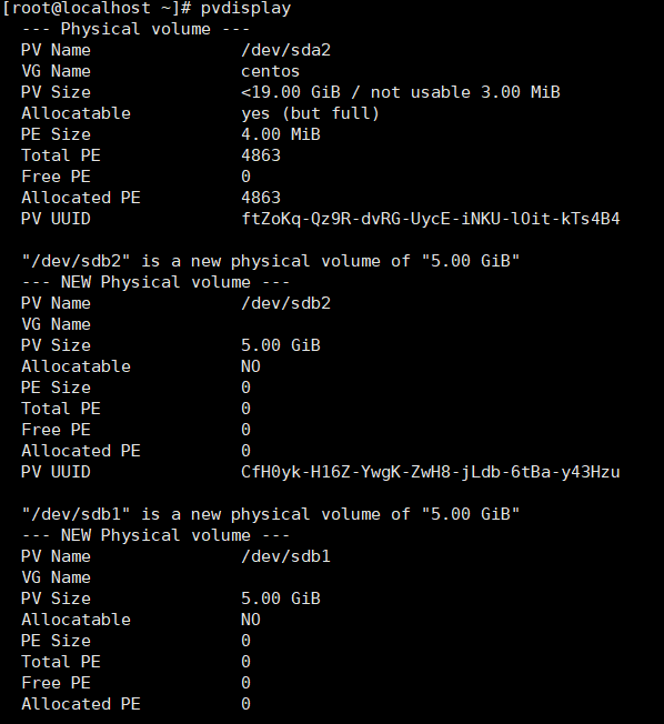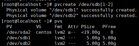 pvcreate /dev/sdb[1-2] 创建两个物理卷轴