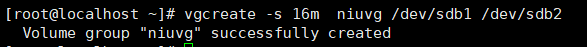 vgcreate -s 16m niuvg /dev/sdb1 /dev/sdb2 //vgcreate是卷组vg niu是卷组名字 s是指定PE的内存大小,PE的大小决定了vg的最大内存。默认为4m,这里设置为16
