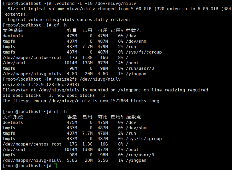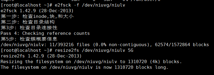 resize2fs /dev/niuvg/niulv 5G 更新逻辑卷大小