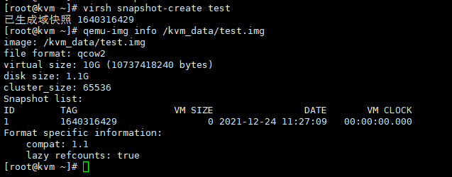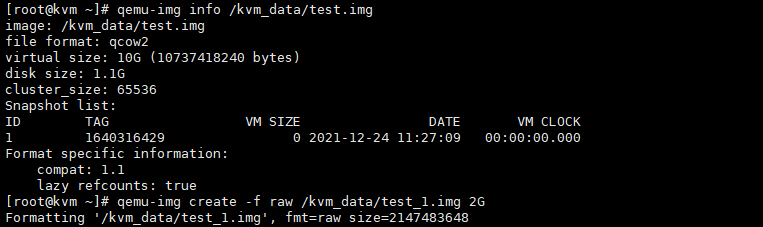 [root@kvm ~]# qemu-img info /kvm_data/test.img //查看test.img信息,同时会查看到快照列表