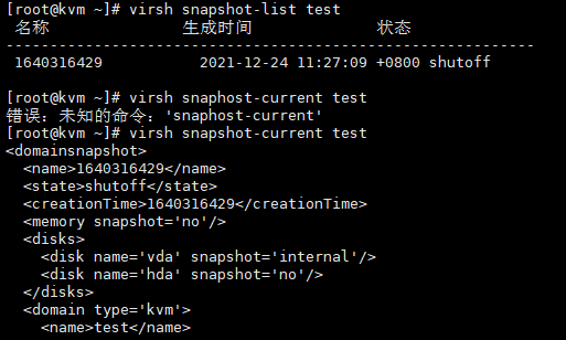 [root@kvm ~]# virsh snapshot-create test //创建快照
