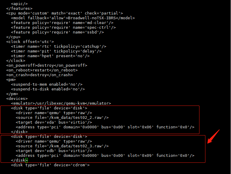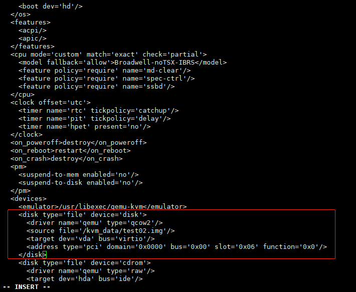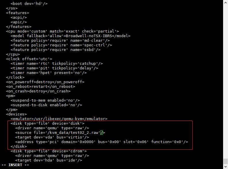 使用virsh edit 编辑test02虚拟机,将新磁盘增加到test02虚拟机,命令如下