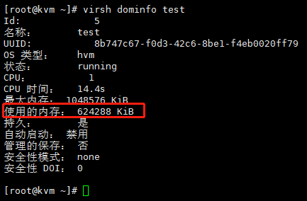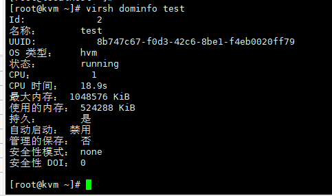 [root@kvm ~]# virsh dominfo test //查看虚拟机配置信息