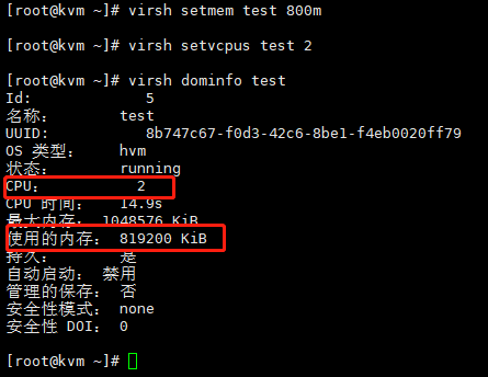 [root@kvm ~]# virsh dominfo test //查看配置信息,看是否修改成功