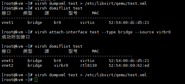 [root@kvm ~]# virsh attach-interface test --type bridge --source virbr0