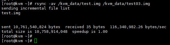 [root@kvm ~]# rsync -av /kvm_data/test.img /kvm_data/test03.img