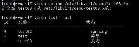 [root@kvm ~]# virsh define /etc/libvirt/qemu/test03.xml //定义新虚拟机