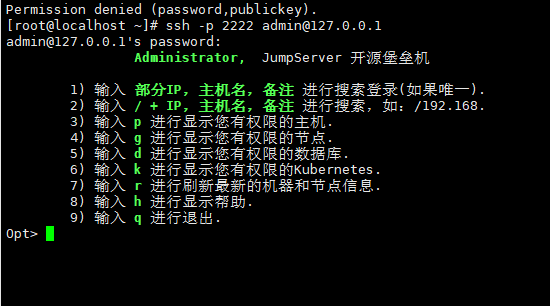 ssh -p 2222 admin@127.0.0.1 #ssh 登陆协议 #-p 选择登录端口,jumpserver登录端口为2222 #admin@127.0.0.1 终端用户名为admin,ip为本地ip127.0.0.1 #登录密码为设置的jumpserver密码。