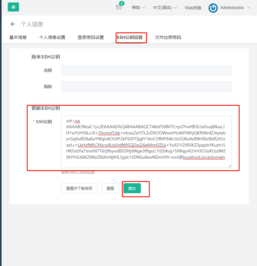 [root@localhost ~]# cat /root/.ssh/id_rsa.pub //查看公钥,粘贴在指定位置。