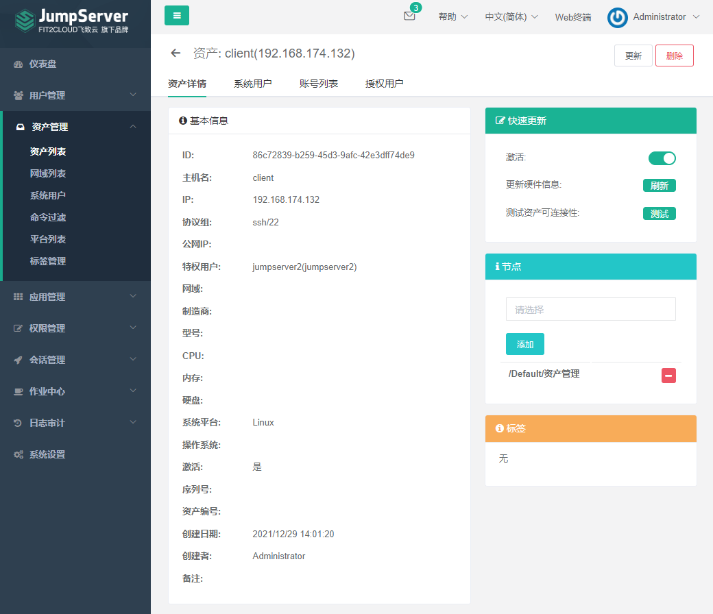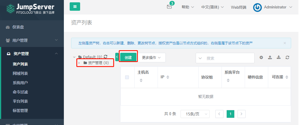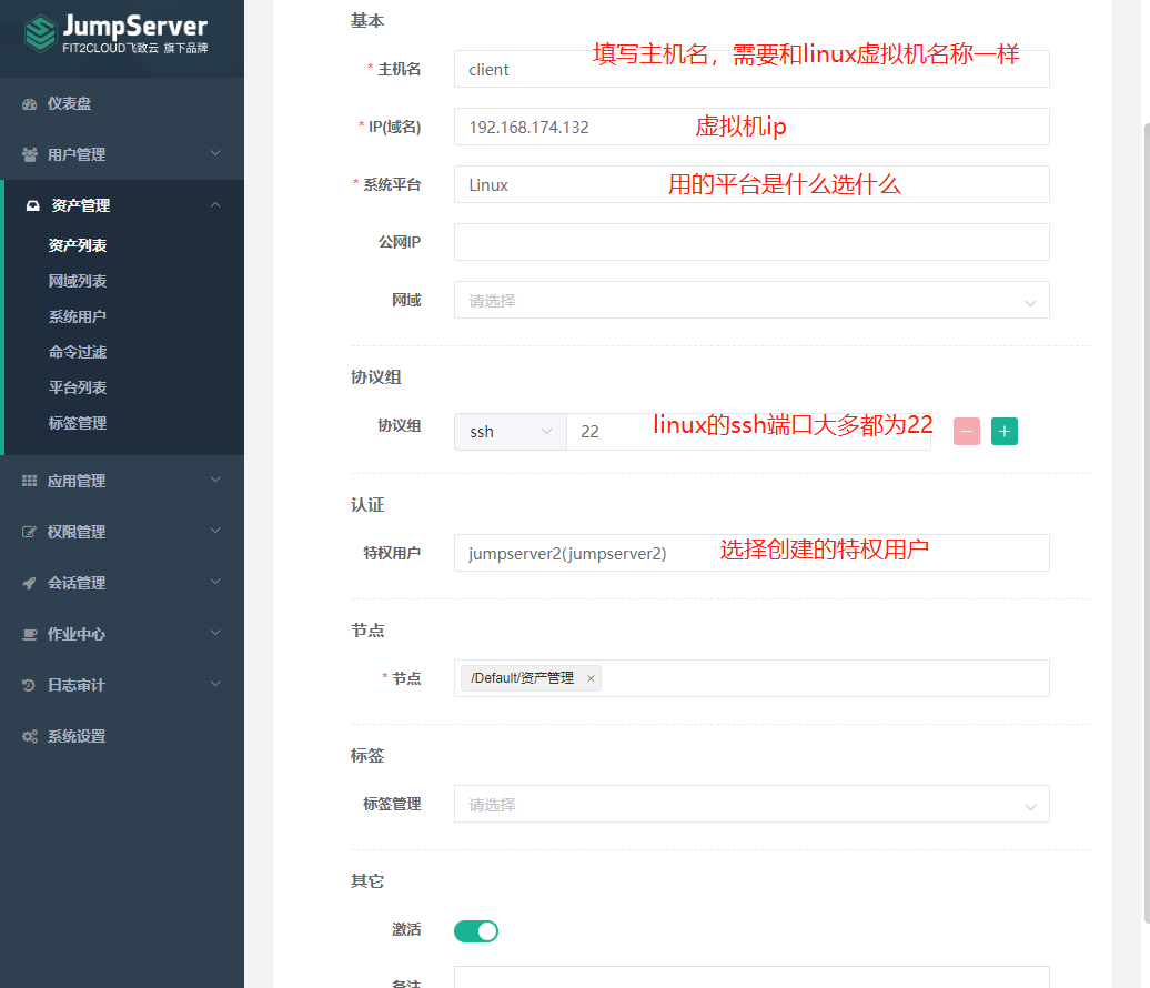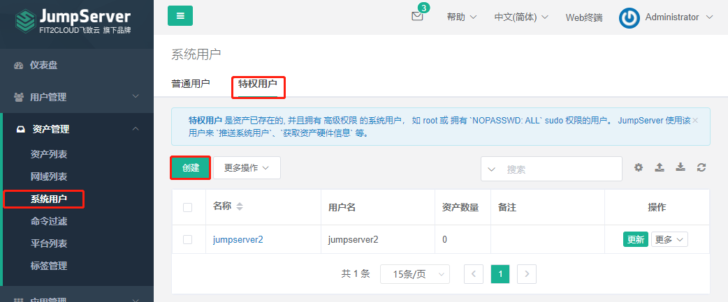 创建一个新的资产——特权用户填写root用户——提交即可。