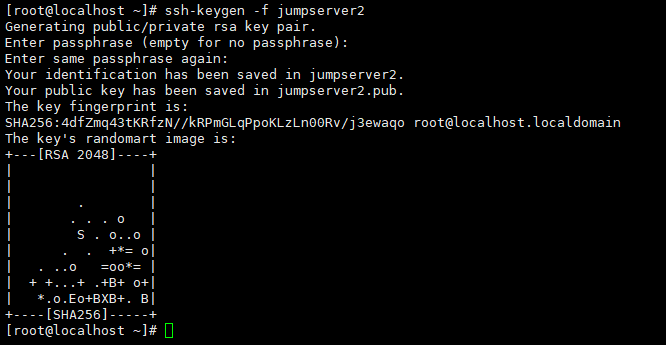 [root@localhost ~]# ssh-keygen -f jumpserver2 #在当前目录下,生成jumpserver2的公钥私钥。