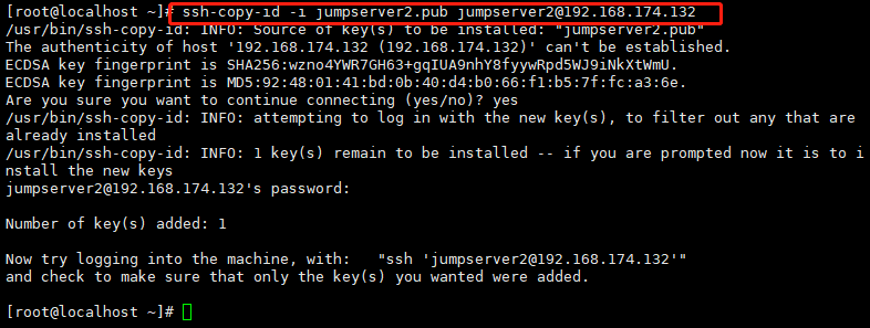 [root@localhost ~]# ssh-copy-id -i jumpserver2.pub jumpserver2@192.168.174.132